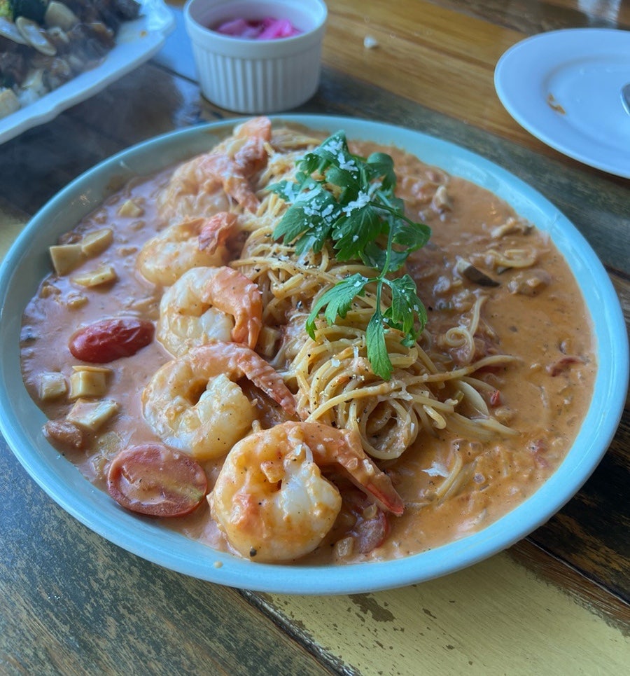 쉬림프 로제 파스타 큼직한 새우와 상큼한 방울토마토 각종 야채들이 가득 담겨 나왔습니다. 먹다가 공기밥찾았습니다.