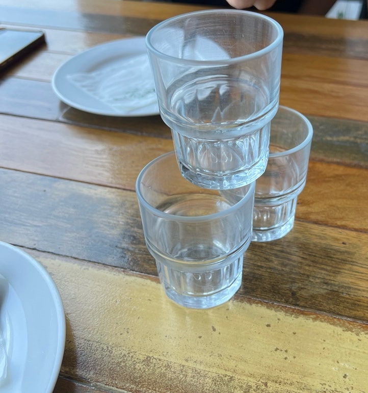 테이블에는 탭으로 주문할 수 있었습니다. 음식 나올 때까지 심심해서 유리컵으로 탑 쌓고 놀고 있었습니다. 식전 빵 같은 것도 인원수에 맞춰서 공짜로 주문 가능합니다. 추가로 먹고 싶으면 천 원 정도 비용이 들었습니다.