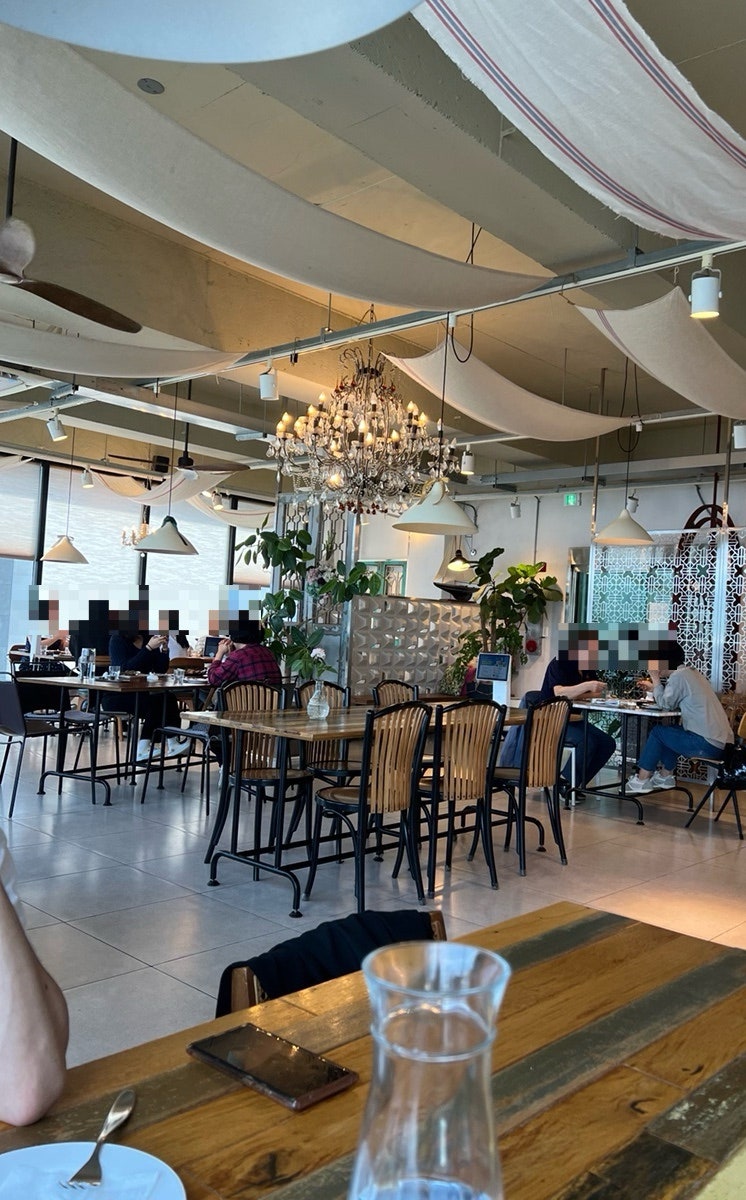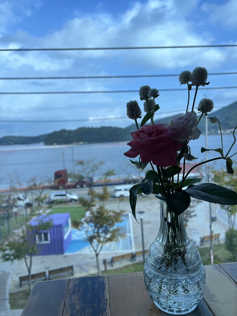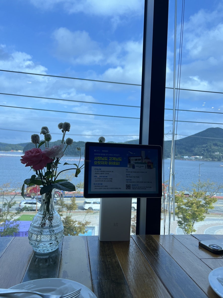 승강기로 3층에 도착하면 바로 왼쪽에 입구가 있습니다. 들어가면 상당히 근사한 인테리어들이 눈에 들어왔습니다. 늦은 점심시간이었는데도 사람이 꽉 차있었습니다. 다행히 예약을 해둬서 창가 자리에 앉을 수 있었습니다. 창가 쪽 자리에서는 죽림 해안로 바다 뷰가 한눈에 들어왔습니다.