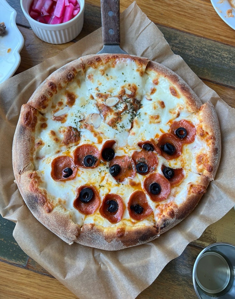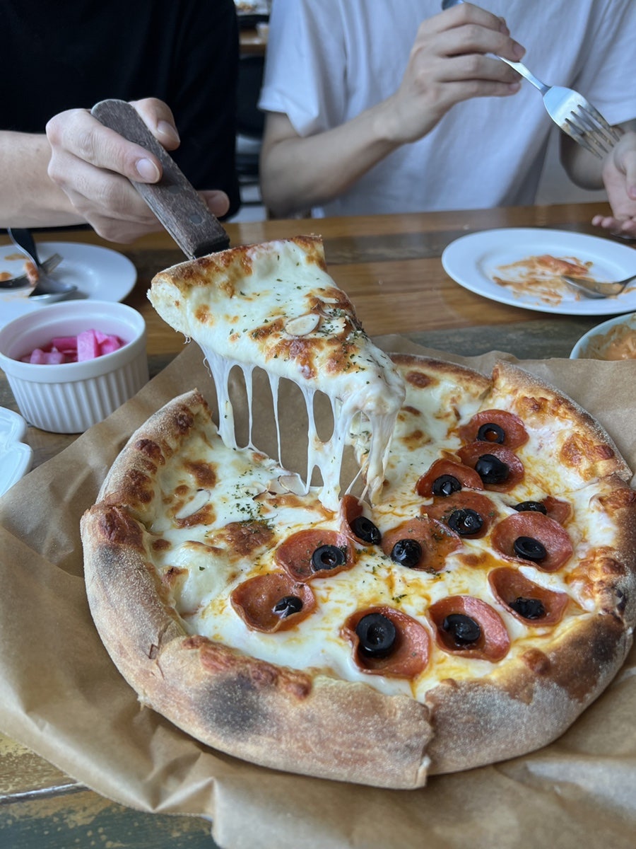 그리고 페퍼로니 고르곤졸라 반반 피자 쭉쭉 늘어나는 치즈와 찍어 먹으면 달짝지근한 꿀까지 같이 줬습니다. 페퍼로니와 올리브를 같이 올려서 줬는데 상당히 맛있었습니다.