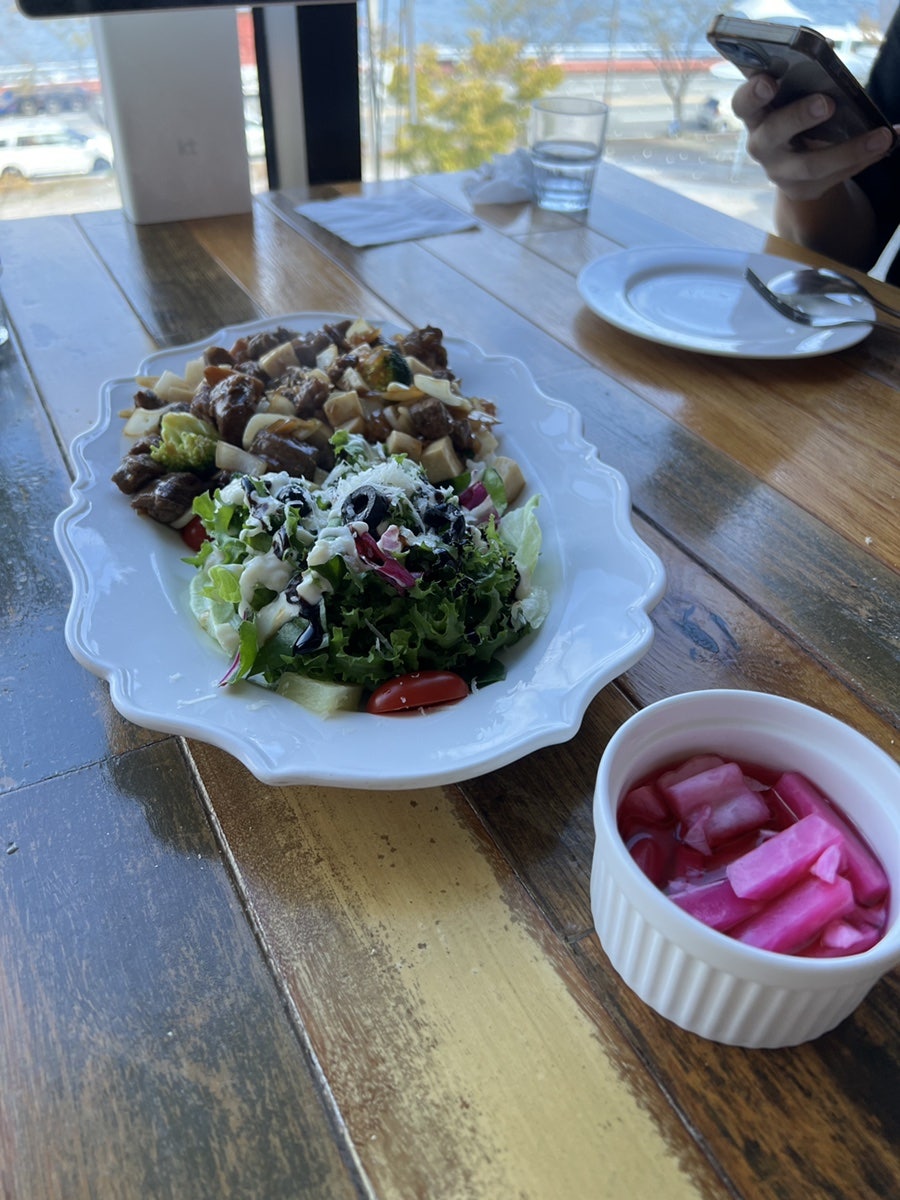 식전 빵 먹고 있던 와중 드디어 든든한 스테이크 덮밥이 나왔습니다. 먹다가 입이 텁텁하면 먹는 피클까지 나왔습니다.